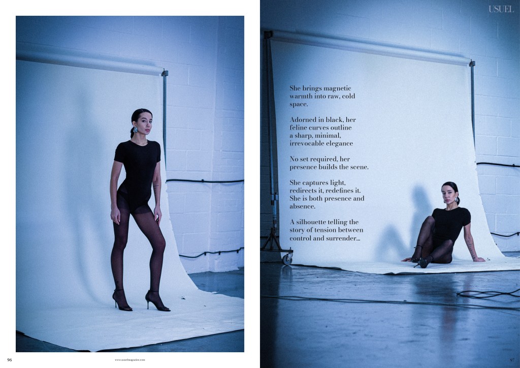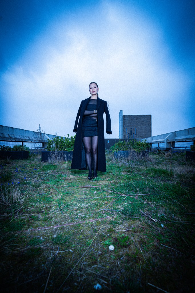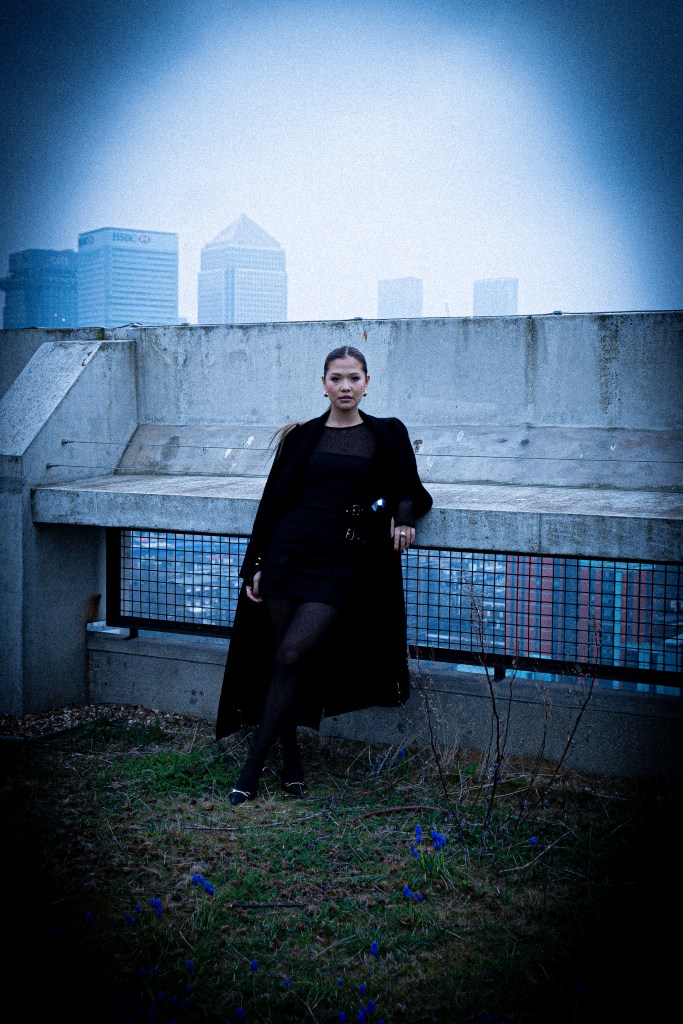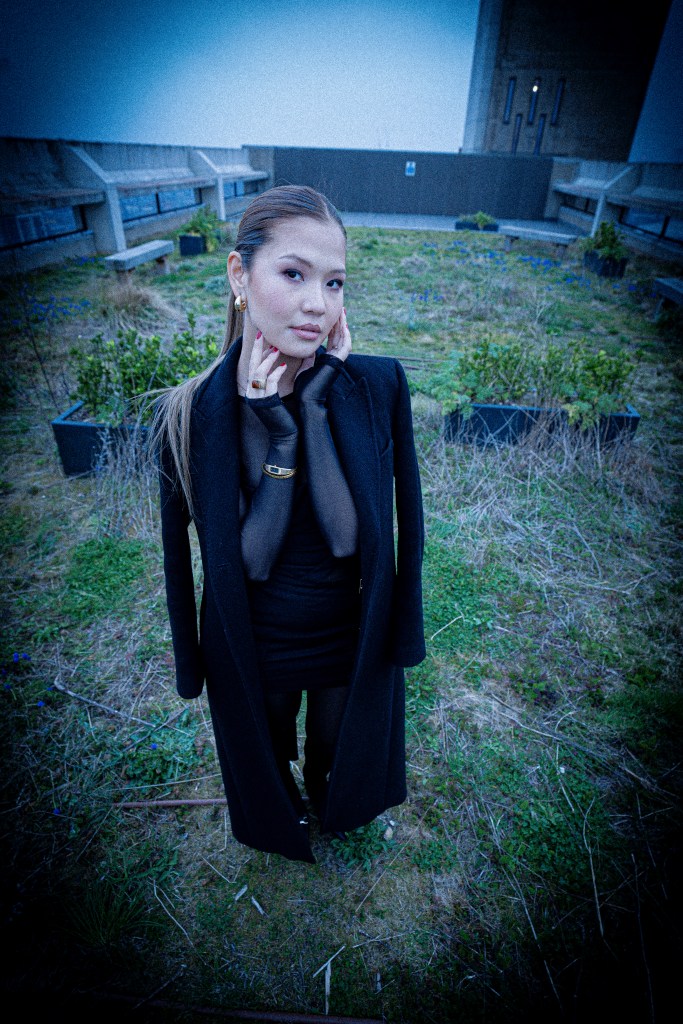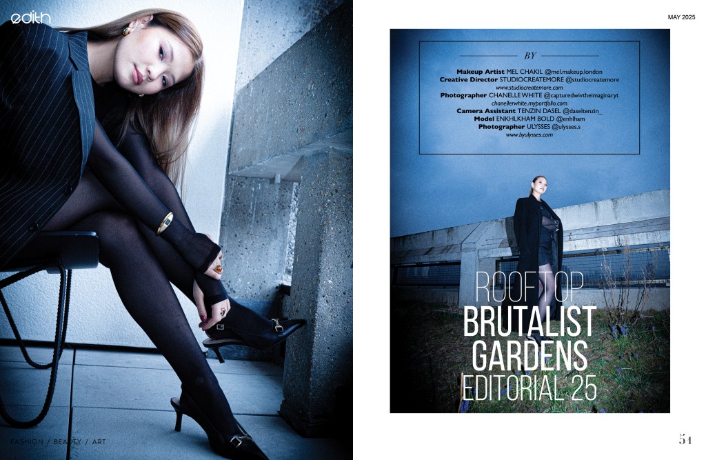 Photographed by Ulysses Saniel atop a Brutalist-inspired rooftop in London, this editorial frames the model against a green landscape and sweeping city skyline. With a sharp blend of raw architecture and natural calm, the shoot captures modern elegance, powered by a dynamic creative team.